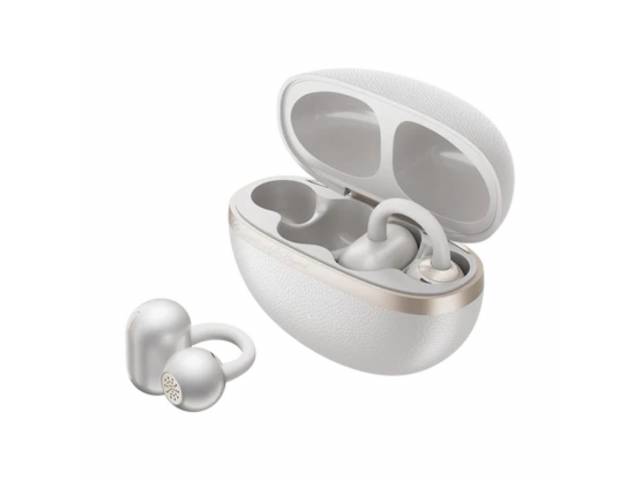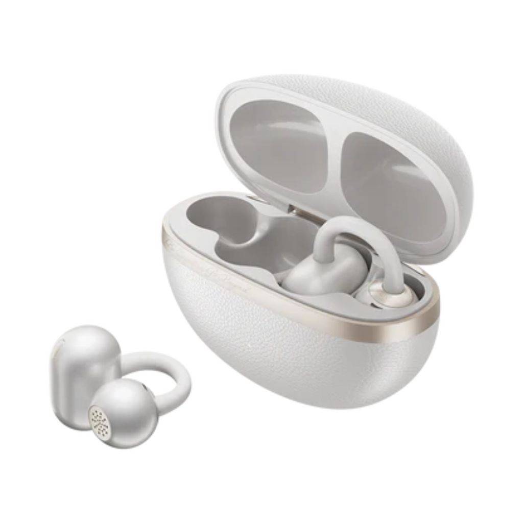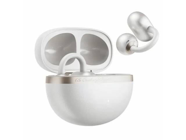 Auriculares inalámbricos de clip abiertos con un estilo retro chic.