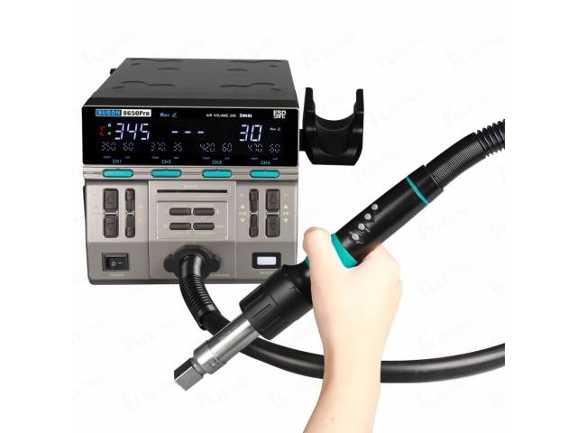 Diseño innovador: Mango enchufable para facilitar el reemplazo de piezas, soporte para boquillas integrado, y un asiento para dormir ajustable.Enfriamiento automático: Al colocar el mango en el soporte, la estación entra en modo de reposo y enfría el elemento calefactor para prolongar su vida útil.
